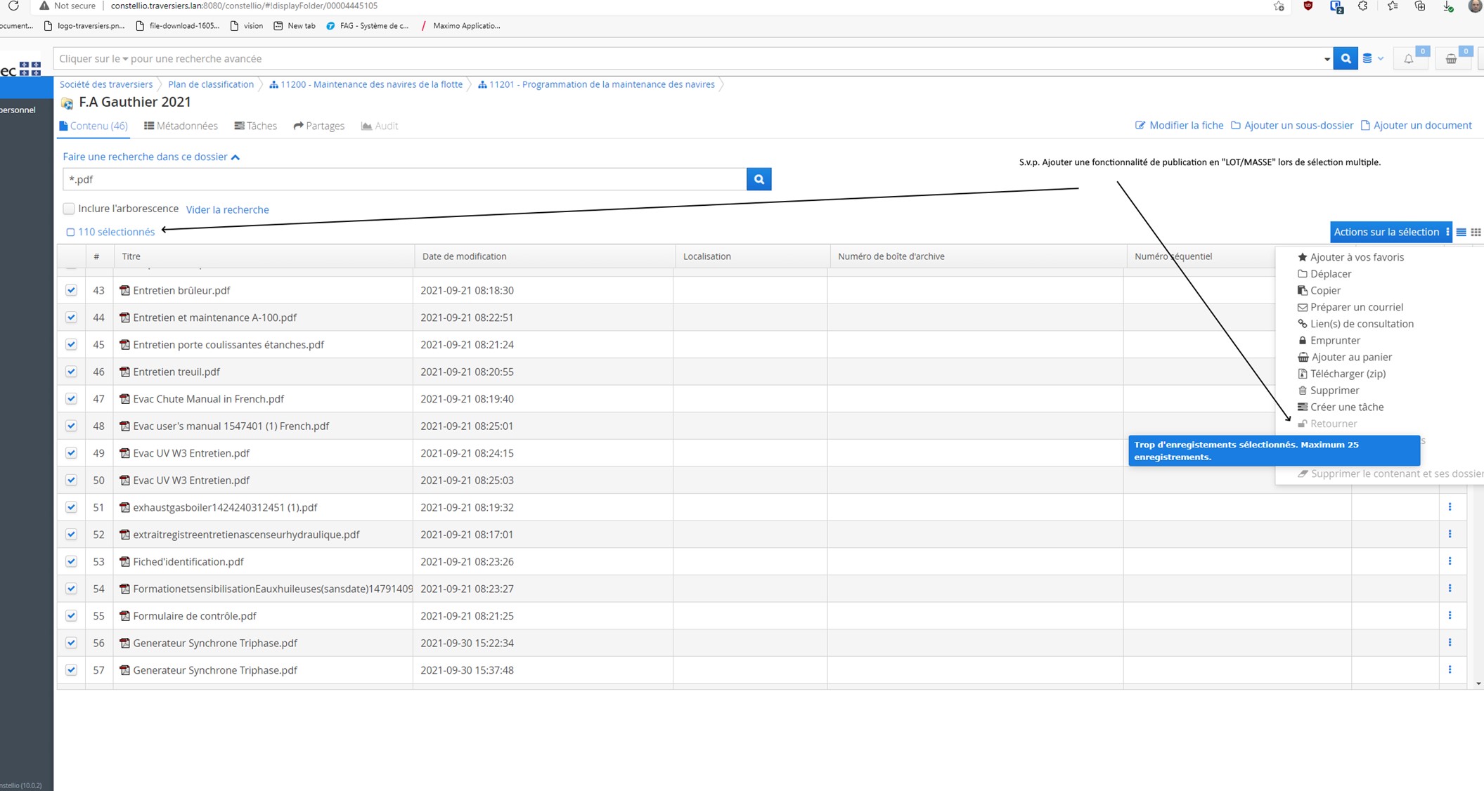 Il serait intéressant de permettre la publication en lot de documents. Nous avons 226 documents à publier et présentement nous devons le faire un à un.