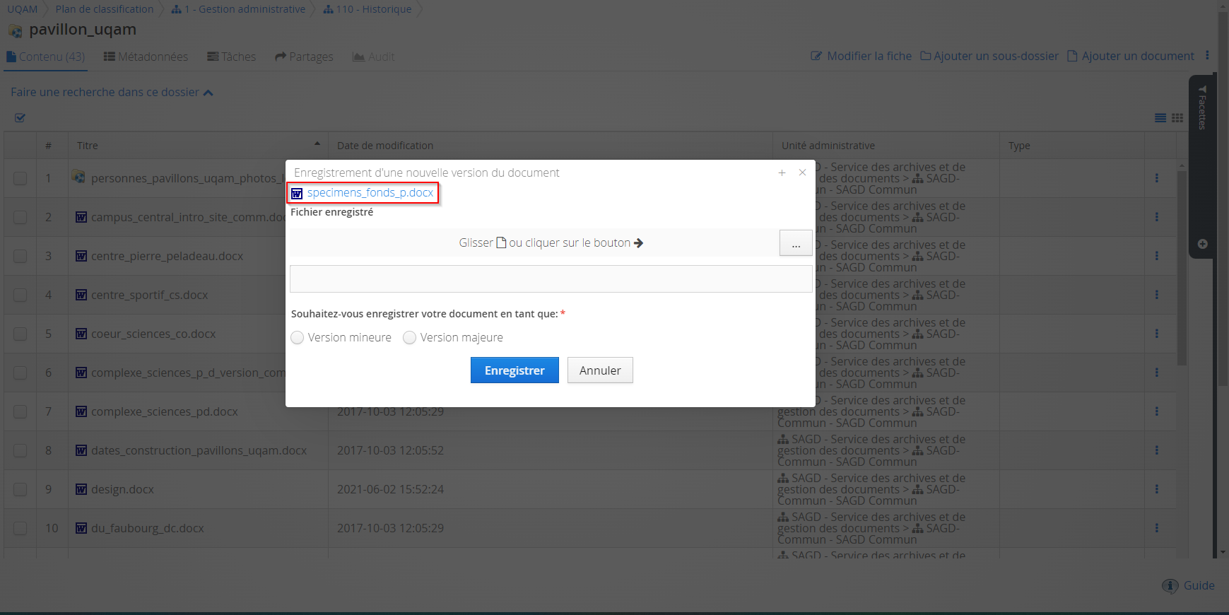 Lorsqu'on téléverse une nouvelle version d'un fichier, serait-il possible d'indiquer le fichier sélectionné dans la fenêtre de téléversement? Cela permettrait, par exemple, d'être certain de ne pas se tromper de ligne lorsqu'on téléverse des nouvelles versions de fichiers à partir des menus des dossiers.